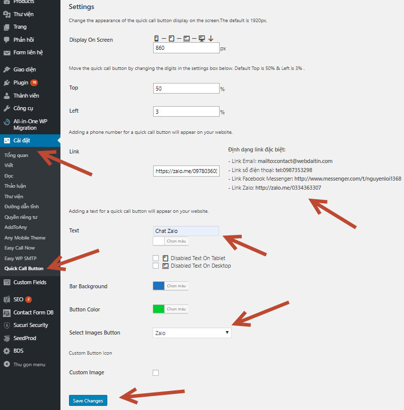 – Còn lại các thuộc tính là màu sắc button, màu nền, hình ảnh là Zalo hay hotline. Ở đây bạn đang tích hợp chat Zalo cho website wordpress vì vậy hãy chọn là Zalo.